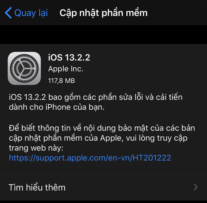 Bản cập nhật iOS 13.2.2 trong cài đặt điện thoại người dùng (ảnh chụp màn hình)